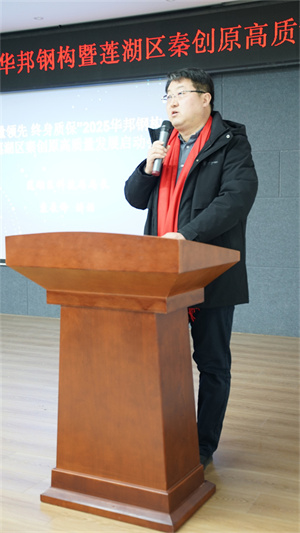 莲湖区科技局局长袁展锋在讲话中指出,华邦钢构作为我省钢结构行业的标杆企业,始终坚持科技创新,注重产品质量,为莲湖区经济社会发展做出了积极贡献。莲湖区作为西安市中心城区,始终把科技创新作为推动高质量发展的核心动力。近年来,莲湖区大力实施创新驱动发展战略,不断优化创新生态,集聚创新资源,培育创新主体,全区科技创新能力显著提升。袁局长希望华邦钢构以此次启动会为契机,坚持创新驱动,加大研发投入,加强核心技术攻关,不断提升产品质量和核心竞争力,努力打造国内一流、国际知名的钢结构品牌。
